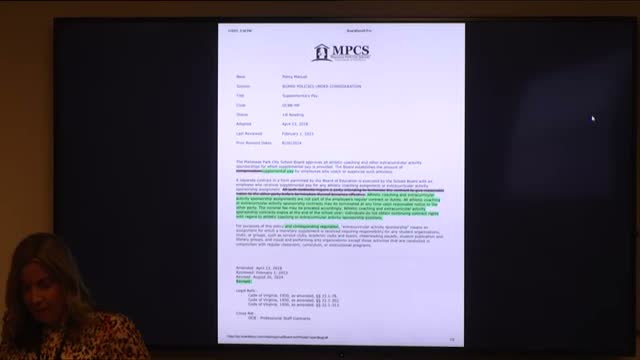 Staff presented revisions that treat coaching and extracurricular duties as separate, yearly contracts, add a corresponding regulation, and formalize hiring, background checks and conflict-of-interest rules for supplementary pay positions.