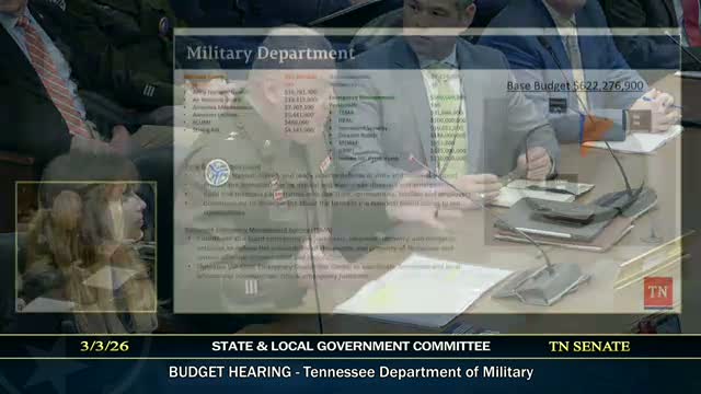 At a March 3 committee hearing, Adjutant General General Ross and Tennessee Emergency Management Director Sheehan briefed senators on readiness, recent disaster response and a base budget; the Guard asked for an $80 million design/build investment at Smyrna and said state support is critical to keep missions and jobs in Tennessee.