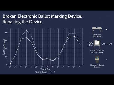 A recorded simulation presentation demonstrates how ballot marking device failures at a busy polling location can substantially lengthen voter wait times. The presentation models a polling place serving 1,500 voters with peak arrival periods in the morning and afternoon, using 3 electronic poll books, 12 ballot marking devices and 1 electronic ballot scanner; under that baseline the modeled average wait time is about 26 minutes.
