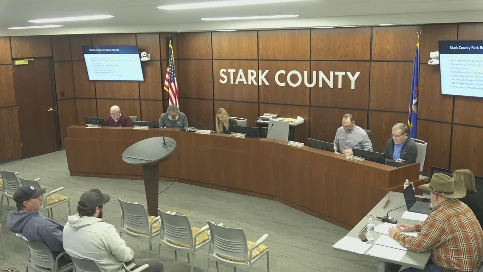 The Stark County Park Board spent substantial time on a draft memorandum of understanding that would give the Stark County 4‑H council a right of first use for a new livestock building in exchange for equipment donations and associated responsibilities.