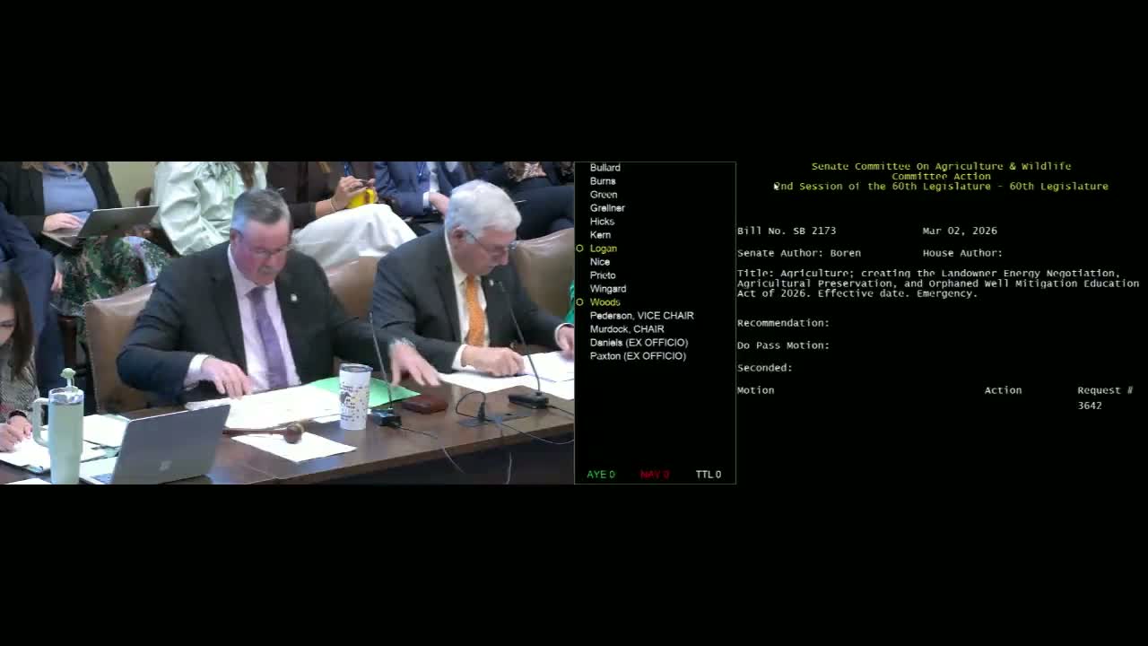 Senate Bill 21-73 would create a landowner energy negotiation and orphaned-well mitigation education program through OSU and Langston extension offices and authorize — but not require — a Corporation Commission fee of $1–$25 per disturbed acre (50% credit for dual use). The committee passed the measure unanimously. (Vote: 12–0)