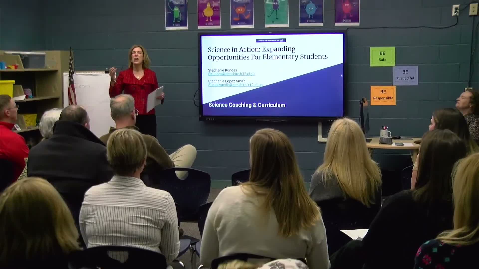 Marlene, introduced by the board chair, opened the Cheshire School District’s elementary showcase and said the district is expanding instructional coaching to deepen hands-on science learning across elementary grades.