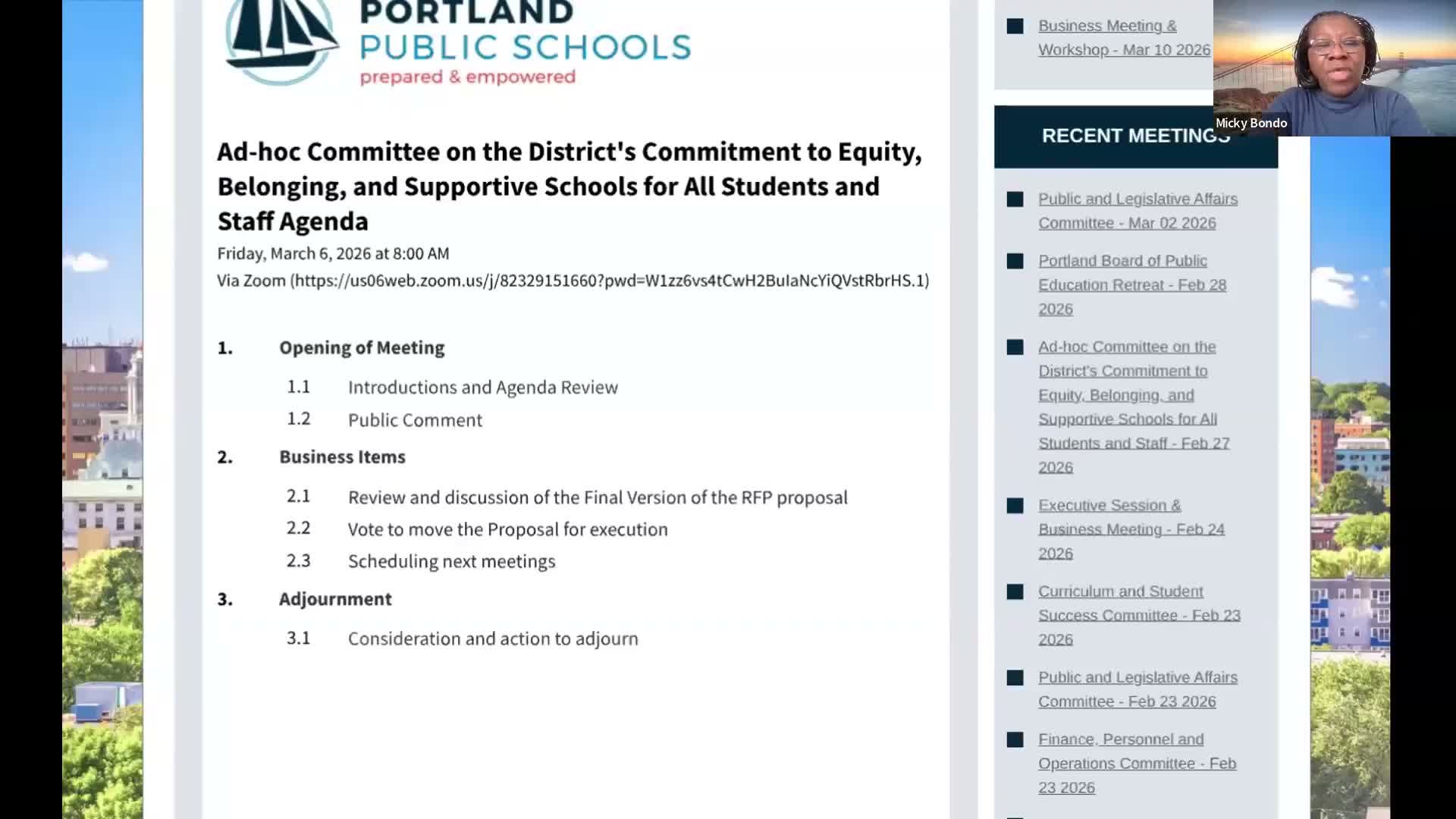 An ad hoc committee met March 6 to finalize an RFP draft, added cultural-competency criteria and vendor qualifications, set submission and question deadlines, and voted 3–0 to advance the RFP to legal review and publication steps.