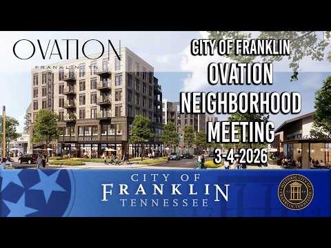 At a Franklin City neighborhood meeting, Greg Gamble of Highwoods and Center Cal presented Revision 4 to the Ovation PUD and requested 14 modifications to development standards — including angled parking on internal drives, a loading area and screen along Crothers Parkway, expanded signage allowances, and an LED screen in Central Park — with questions raised about transit access and truck deliveries.