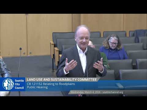 The Seattle City Council Land Use & Sustainability Committee on March 4, 2026 opened a public hearing on Council Bill 121152, a proposal to adopt permanent floodplain development regulations to align Seattle code with Federal Emergency Management Agency (FEMA) flood insurance rate maps. The committee heard two in-person public speakers and extensive staff explanation of mapping, modeling and next steps, but did not vote.