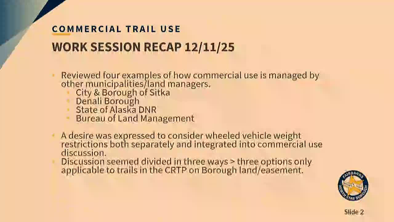 Trail staff presented three options — a simple vehicle-weight policy, a parks-and-rec commercial-use policy tied to existing frameworks, or a codified trail-specific commercial-use program. Commissioners favored a hybrid approach and declined (3-3) to send a draft letter urging adoption of the Alaska DNR wheeled-vehicle policy to the mayor.