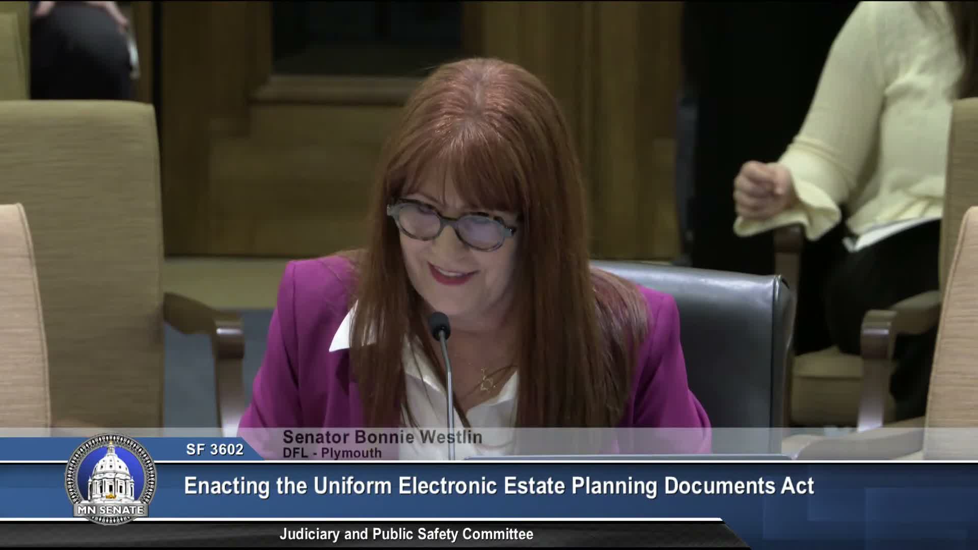 Senate File 3602 would allow non-testamentary estate-planning documents — trusts, powers of attorney, health care directives — to be signed, witnessed, notarized and maintained electronically; sponsors and bar/uniform-law commissioners said the measure improves access and includes security safeguards such as visual/audio notarization and audit trails.