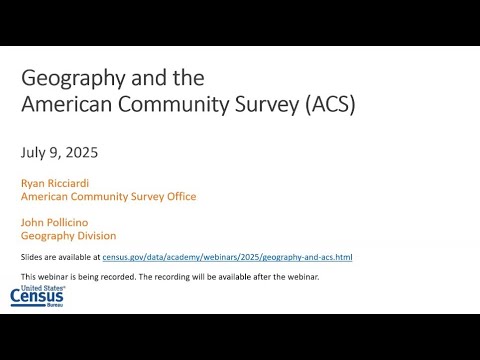 U.S. Census Bureau presenters explained how the American Community Survey (ACS) uses geographic definitions and vintages, demonstrated TigerWeb and data.census.gov features, and described data‑product thresholds and new topic releases.