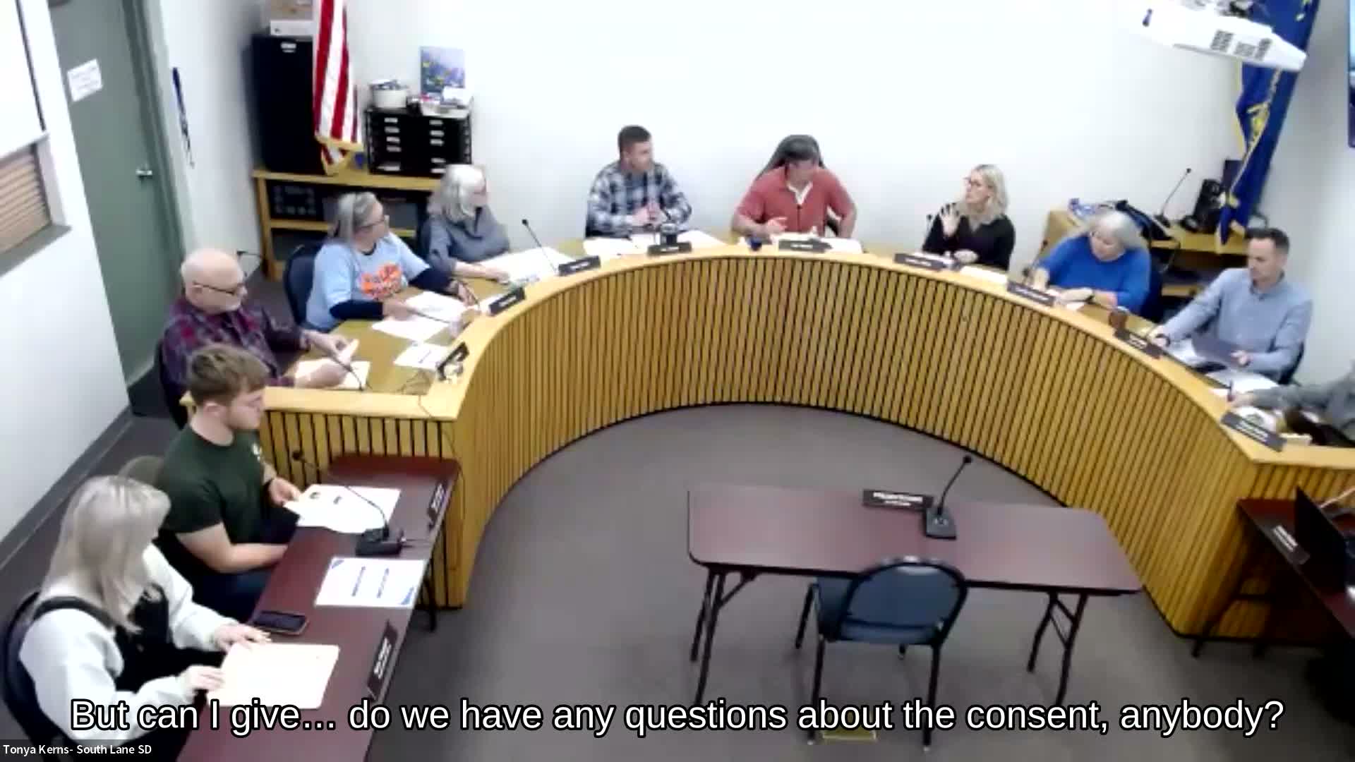 The South Lane School District board approved the meeting's consent agenda following a motion from a board member and a voice vote. The motion to accept the consent agenda was made by a board member (speaker 3) and the chair recorded the vote as 'Aye' with no opposition.