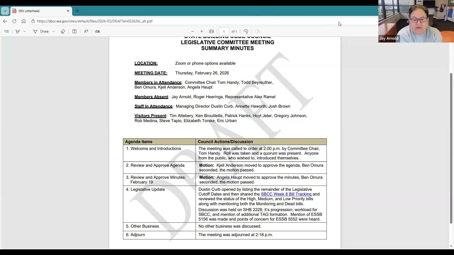 At its March 5 legislative committee meeting the State Building Code Council received a bill-status update: Kent Holmes’ Bill 5552 has passed and will require the Council to adopt rules for kit homes by March 2027; several other bills and tags likely to affect code cycles were also reviewed.