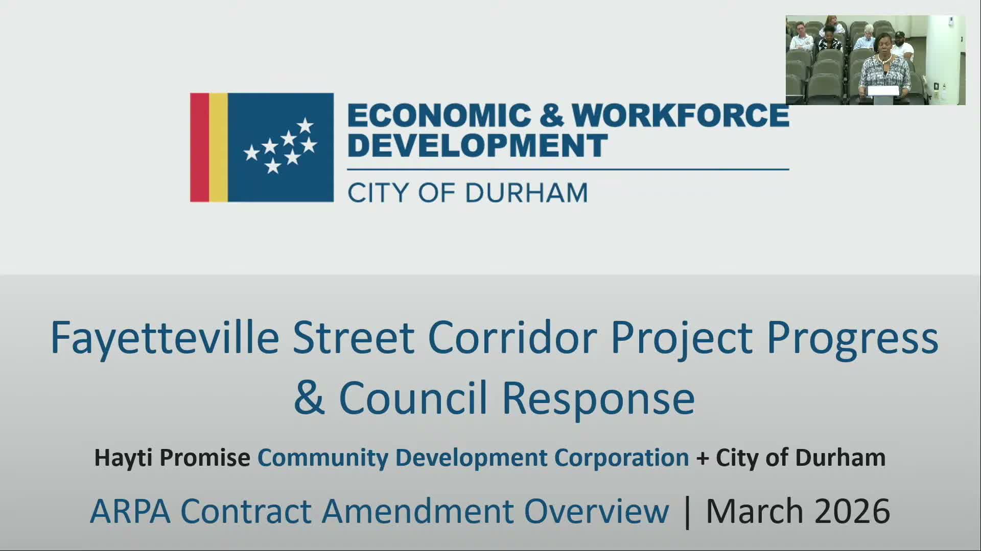 Durham — City staff and the volunteer board of Hayti Promise CDC faced sharp public scrutiny Monday over a $10 million American Rescue Plan Act (ARPA) award aimed at revitalizing the Fayetteville Street corridor, even as board members and staff detailed early program activity.