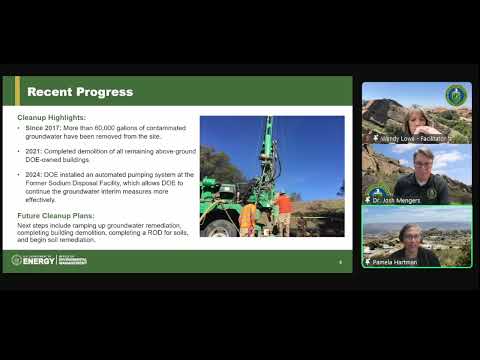 Pamela Hartman, DOE’s Deputy Federal Project Director, described recent cleanup actions: since 2017 the groundwater implementation plan has removed more than 60,000 gallons of contaminated groundwater from the former sodium disposal facility; in 2024 DOE installed a solar-powered automated pumping system and pumped about 2,700 gallons in January and February 2025. Hartman also said DOE completed demolition of all above-ground DOE-owned buildings in 2021, and that remaining work includes below-grade structures, additional soil remediation and completing a soils ROD.