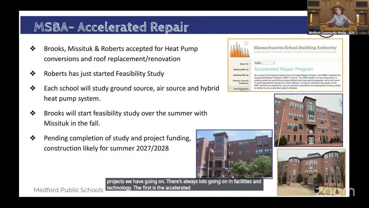 The Medford School Committee received an operations update March 2 detailing feasibility studies, energy upgrades and IT/security work across the district. Kenneth Lord, chief operations officer, said three elementary schools (Brooks, Misotuck/Mistock and Roberts) were invited into the Massachusetts School Building Authority's Accelerated Repair Program (ARP) and that owners' project managers and engineers will begin feasibility work to evaluate ground-source, air-source and hybrid heat pump options, roofs, electrical upgrades and any necessary terminal equipment.