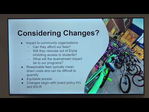 Brian Cocchi, who presented the district’s facilities usage overview, told the Elyria City School Board on March 4 that state law and district policy set the basic rules for renting school property and that the district already uses a tiered fee system and an online booking tool for community groups. Cocchi cited Ohio statutes he identified as 3313.76 and 3313.77 and noted district policies KG and KGR as the implementing framework.