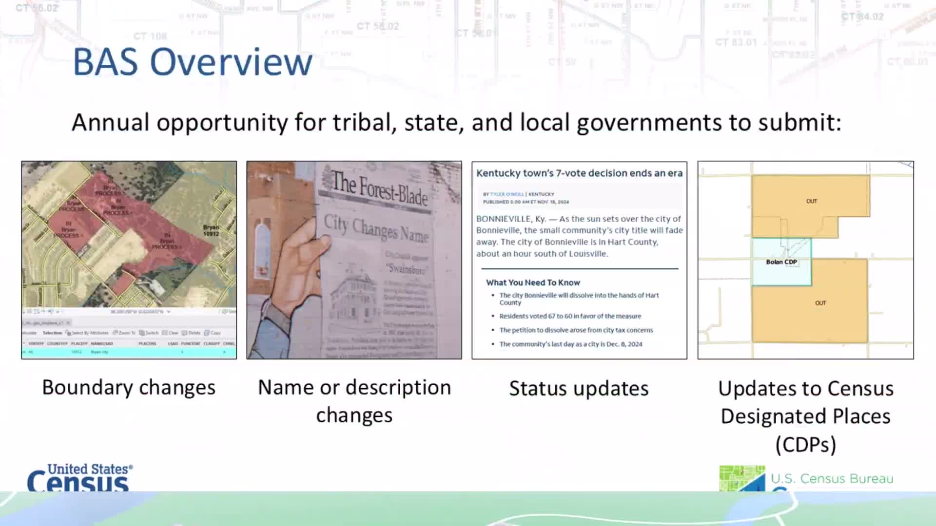 A U.S. Census Bureau webinar explained the Boundary and Annexation Survey (BAS), who may participate, how the BAS supports census and federal funding counts, and the key dates—boundaries must be effective by Jan. 1 and submissions for certain products are due March 1 (May 31 is the final submission window for next-year materials).