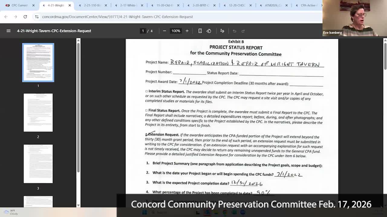The Concord CPC deferred action on the Wright Tavern preservation extension after members raised unclear scope, potential reallocation of funds and the absence of a signed preservation restriction; the applicant was asked to provide clearer accounting and documentation for the April meeting.