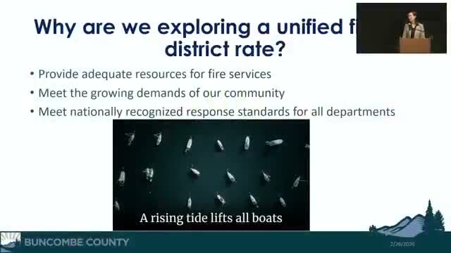 Buncombe County staff presented a proposal Thursday for a single unincorporated fire tax district intended to equalize funding across local fire departments while preserving existing department operations and elected boards. Staff said the change would create a single rate on property tax bills for unincorporated residents while funds would be allocated to departments to support response standards and contracts.
