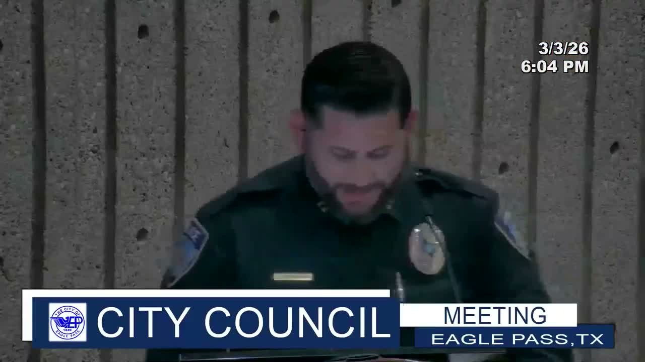 Provenance: Transcript of the Eagle Pass City Council regular meeting, March 3, 2026 (Captain Barrientos presentation SEG 615—SEG 677).
