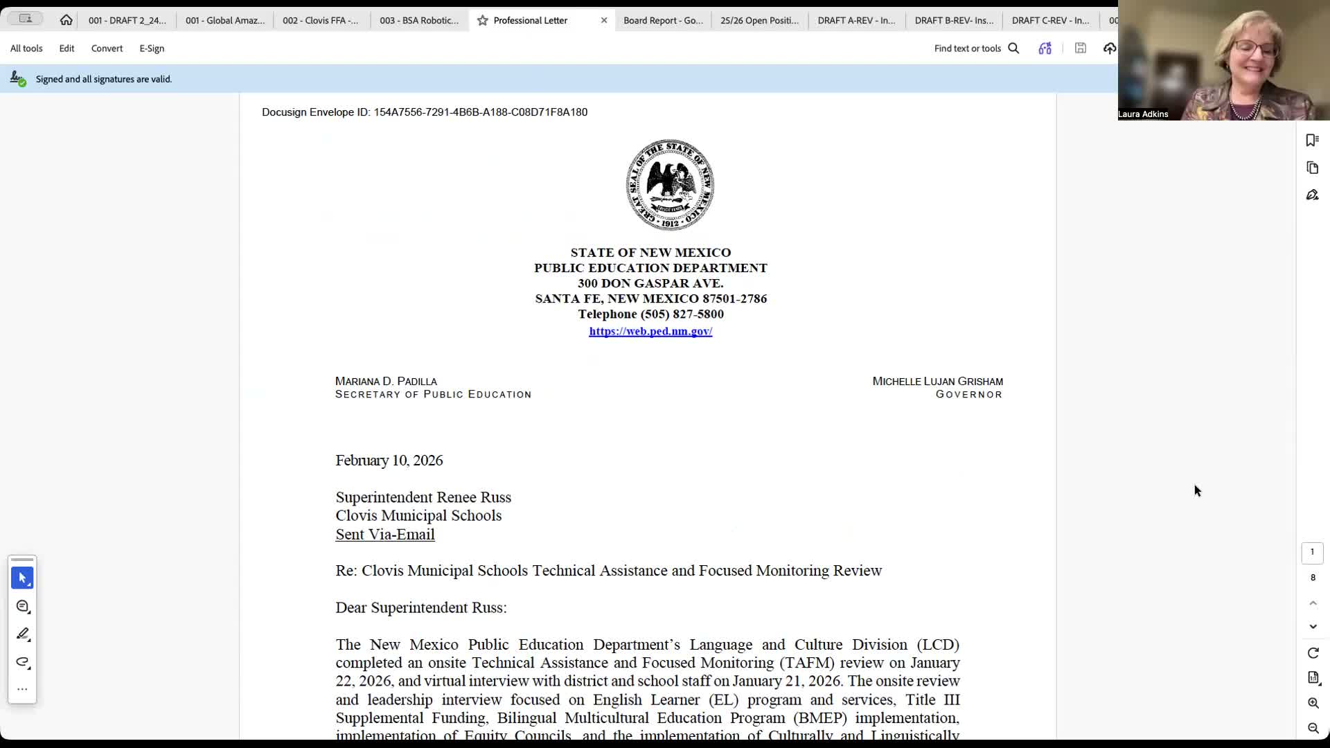 Laura Adkins, participating virtually as the PED reviewer, said the team praised leadership presentations and on‑site classroom observations at Clovis High School and La Casita, calling the district's English language development instruction "one of the best we have seen across the state." She said the review covered Title III, bilingual/multicultural programs and equity council work and included desktop and site visits.