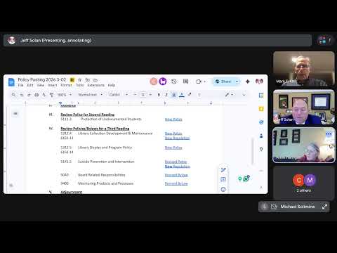 The policy committee reviewed third-reading materials required by state law for library collection development and display and moved those items forward for additional consideration by the full board.