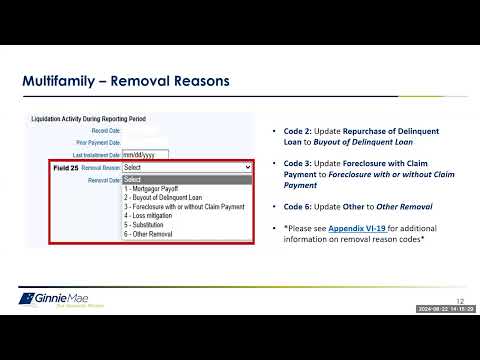 Ginnie Mae held an August 22 webinar to walk issuers through 11 new RFS loan-level fields, updated removal reason codes and exception rules that go into production Sept. 1, 2024; presenters explained required fields (servicer/subservicer IDs, document custodian numbers, scheduled amounts, service fees, curtailment codes) and how exceptions will be handled.