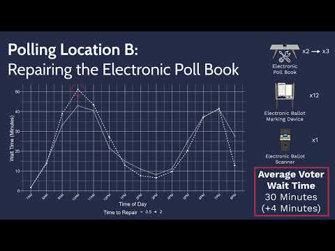 A narrated simulation of election‑day operations found that failures of electronic poll books can sharply increase voter wait times and that rapid repairs or sufficient paper backups and extra check‑in capacity substantially reduce delays.