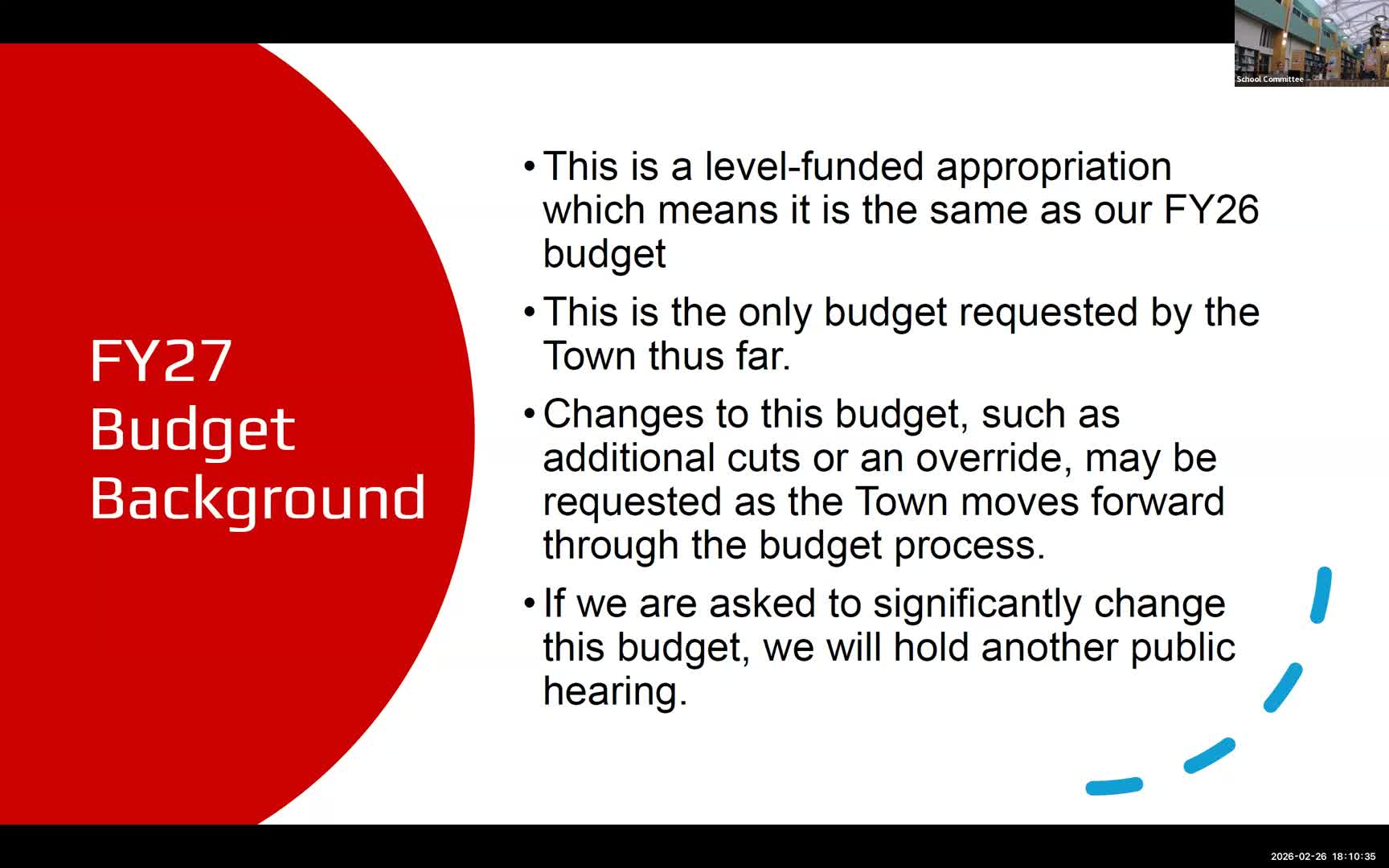 - Whether the committee votes next month to present a different recommendation to town meeting or to place an override question on the warrant. - Any follow-up budget revisions driven by town revenue projections, finance-committee consultations, or new information about enrollment and special-education placements.