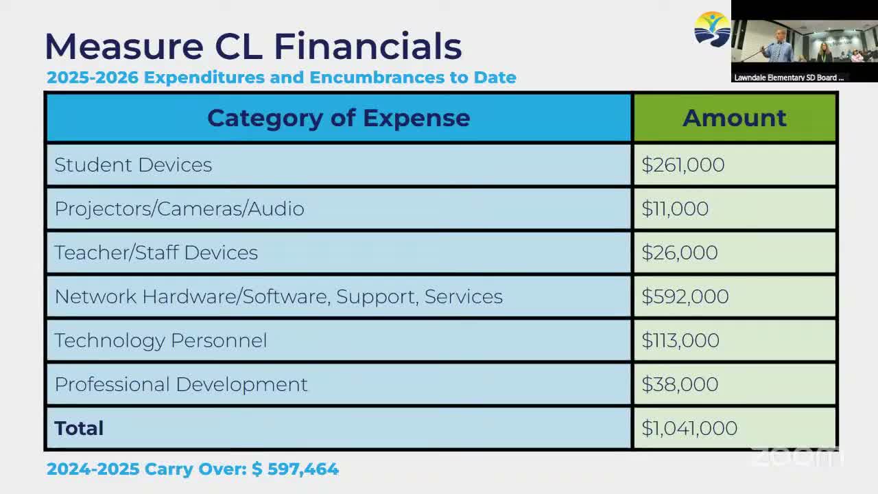 District technology and instructional leaders updated the board on Measure CL spending and the district's AI task force, reporting device purchases, infrastructure upgrades and early classroom pilots of generative‑AI tools.