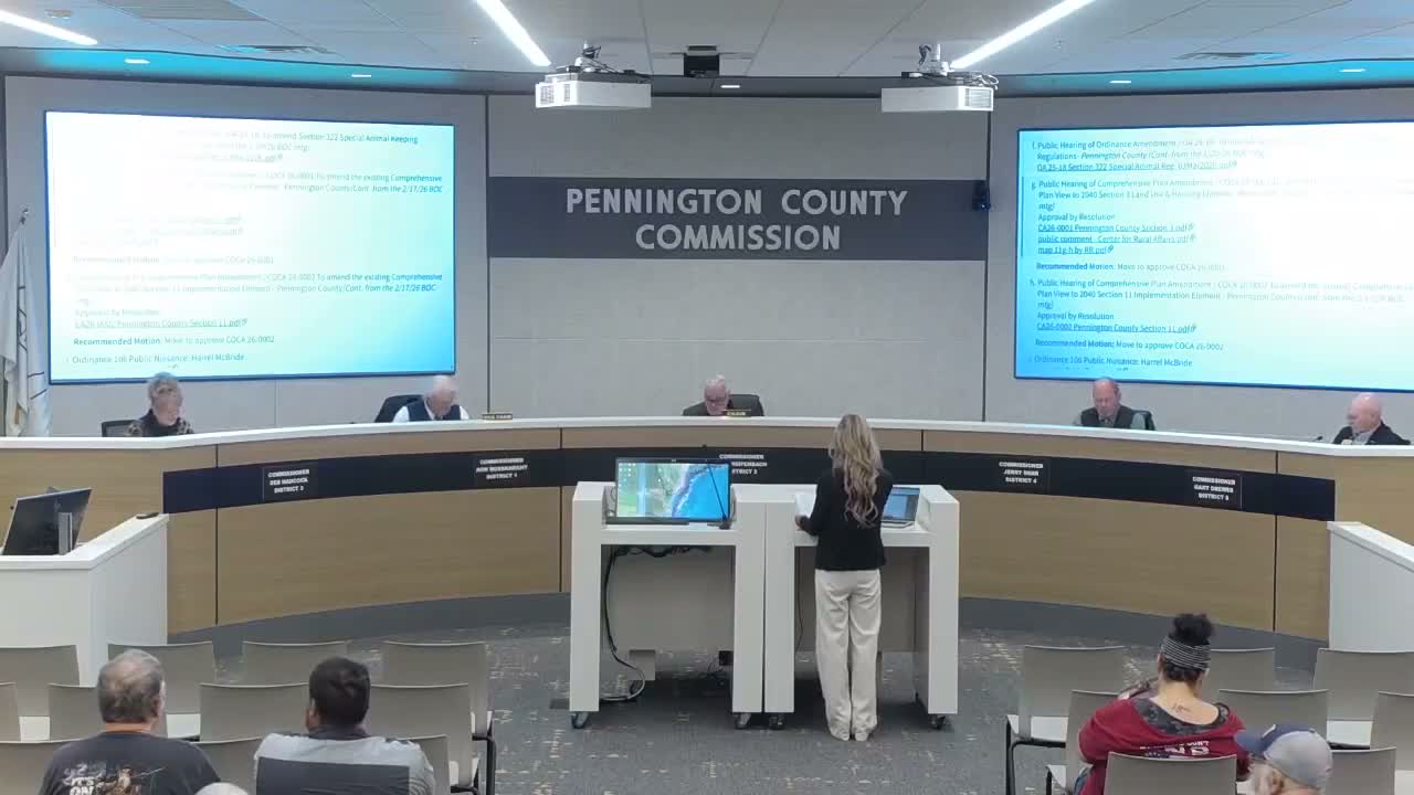 Commissioner Hatcock warned about thermal-runaway risks from lithium battery storage and potential chemical run-off from panels, framing the change as a health, safety and welfare decision. Other commissioners emphasized the lengthy public process and community consensus in eastern Pennington County that large plants should not be sited in agricultural districts.