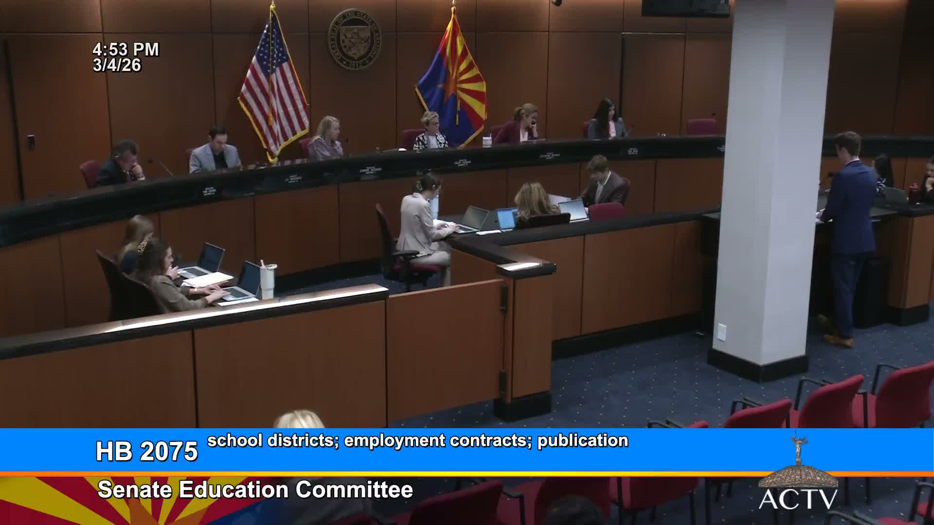 House Bill 2075, which would require school district governing boards to submit superintendent and chief financial officer employment contracts to the Arizona Department of Education and post specified compensation details online for at least five years, received a due-pass recommendation from the Senate Education Committee.
