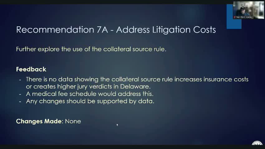 Proponents argued the collateral-source rule—a doctrine that in many cases allows plaintiffs to recover full charges even when some medical services were covered by insurance—can add to medical-cost severity and thus insurance premiums. One member urged the task force to study how other states have modified the rule and whether Delaware could adopt an exemption tailored to reduce cost severity.