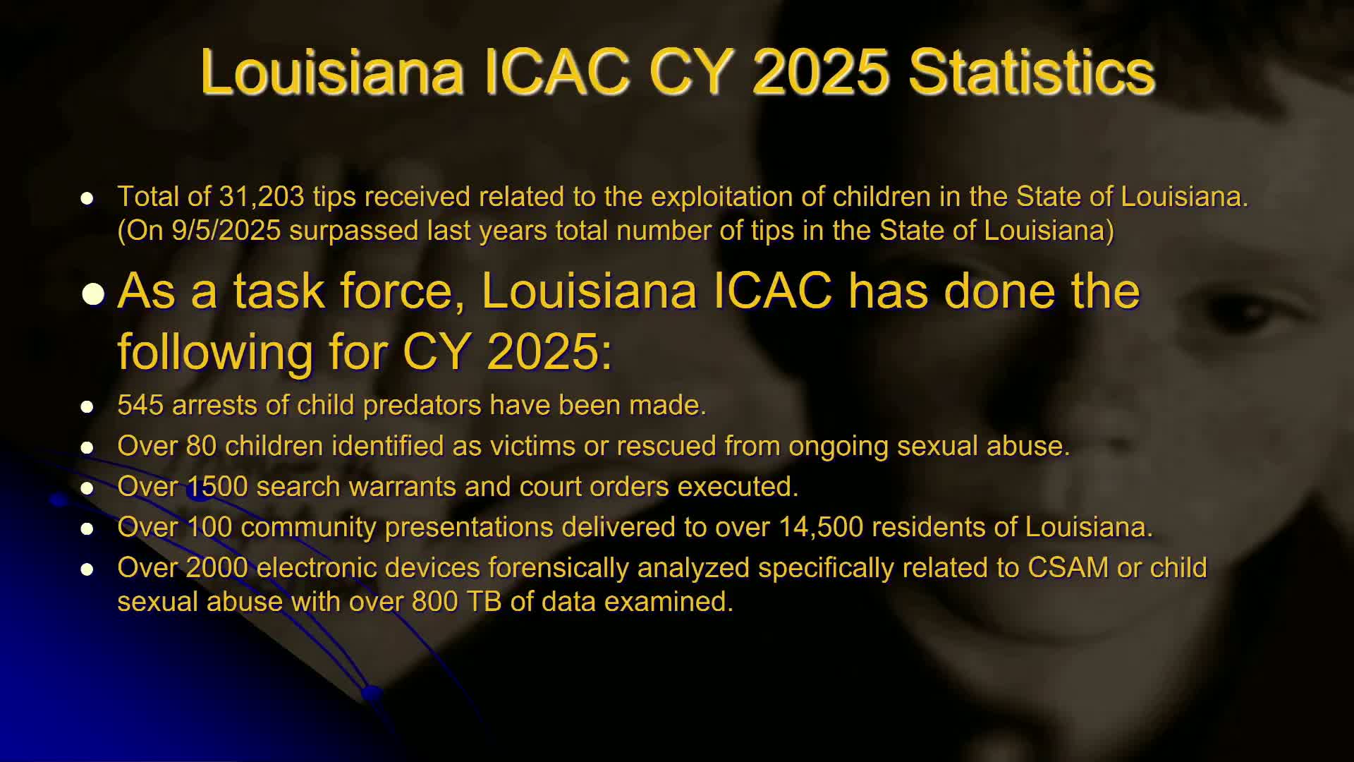 “Last year we had a total of 31,203 tips related to exploitation of children in the state of Louisiana,” Masters said. He described a record year for 2025 that included 545 arrests, more than 80 children identified or rescued from ongoing abuse, and more than 1,500 executed search warrants. The task force now includes more than 80 local, state and federal partners, Masters said.