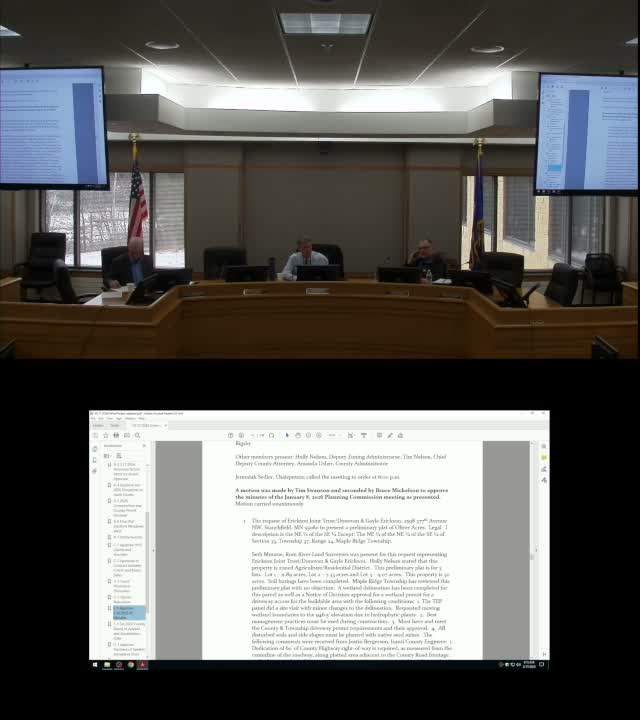Planning staff presented a preliminary plat from the Erickson Joint Trust (Oliver Acres) in Maple Ridge Township: three lots on a roughly 30-acre parcel with soil borings and wetland delineation completed. The planning commission recommended approval and the board voted unanimously to accept the preliminary plat.