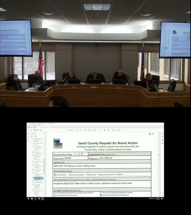 Sheriff's Office: The sheriff asked the board to accept an off-highway-vehicle (OHV) safety grant (two-year period 07/01/2025'to'06/30/2027) totaling $11,824.76 that staff said would be used to purchase an ATV better suited for summer patrols and to resume youth ATV-safety courses with the DNR. The board approved the grant and the sheriff's proposed plan. The board also approved a snowmobile-safety grant in which staff reported $8,858.02 per fiscal year (staff said the grant primarily funds deputy overtime for trail patrols and community ice-fishing safety outreach).