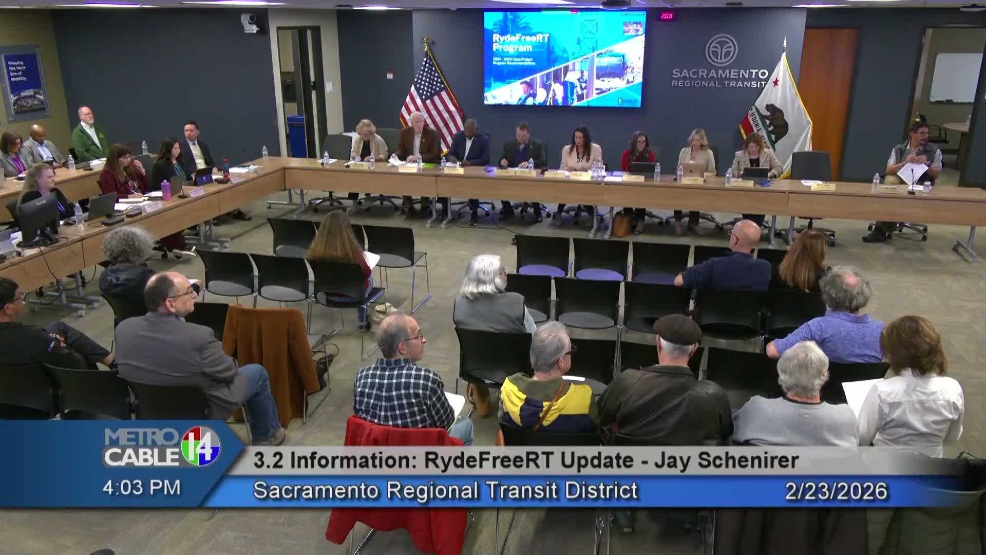 Chris Flores and community partners briefed the Sacramento Regional Transit Board on the Ride Free RT student program on Feb. 23, highlighting outreach results and proposed governance changes.