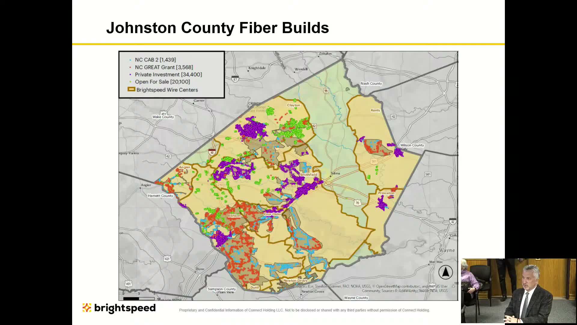 Brewer said about 700 of the original GREAT‑grant locations in Johnston County are live and available for subscribers, roughly 1,500 CAB2 frames are scheduled for delivery by the end of the year, and more than 20,000 privately funded fiber passings are already in place. "With the original schedule, the GREAT grant program should have been delivered to you now," he said, estimating about 20% of the original GREAT projects are up and running and that final construction moves quickly once pole‑attachment authority is secured.