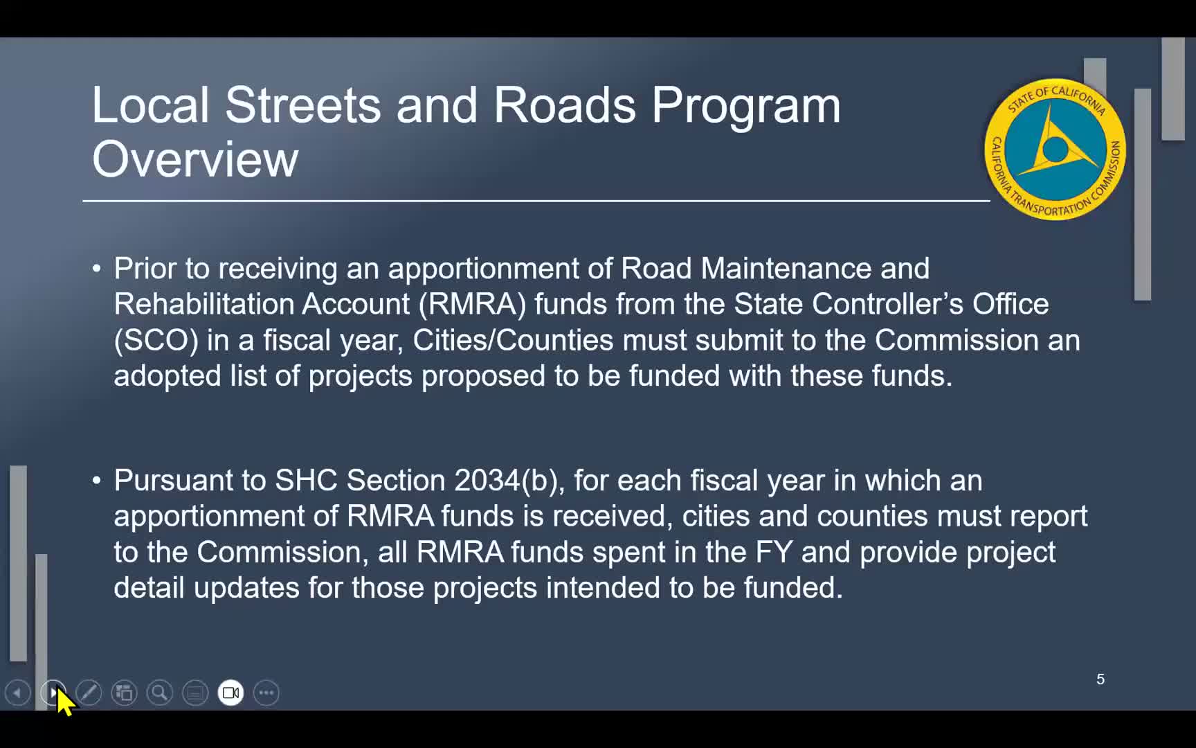 The California Transportation Commission held a Cal Smart technical training guiding cities and counties through annual RMRA (local streets and roads) expenditure reporting, deadlines, what counts as reportable spending, and where to find apportionments and estimates.