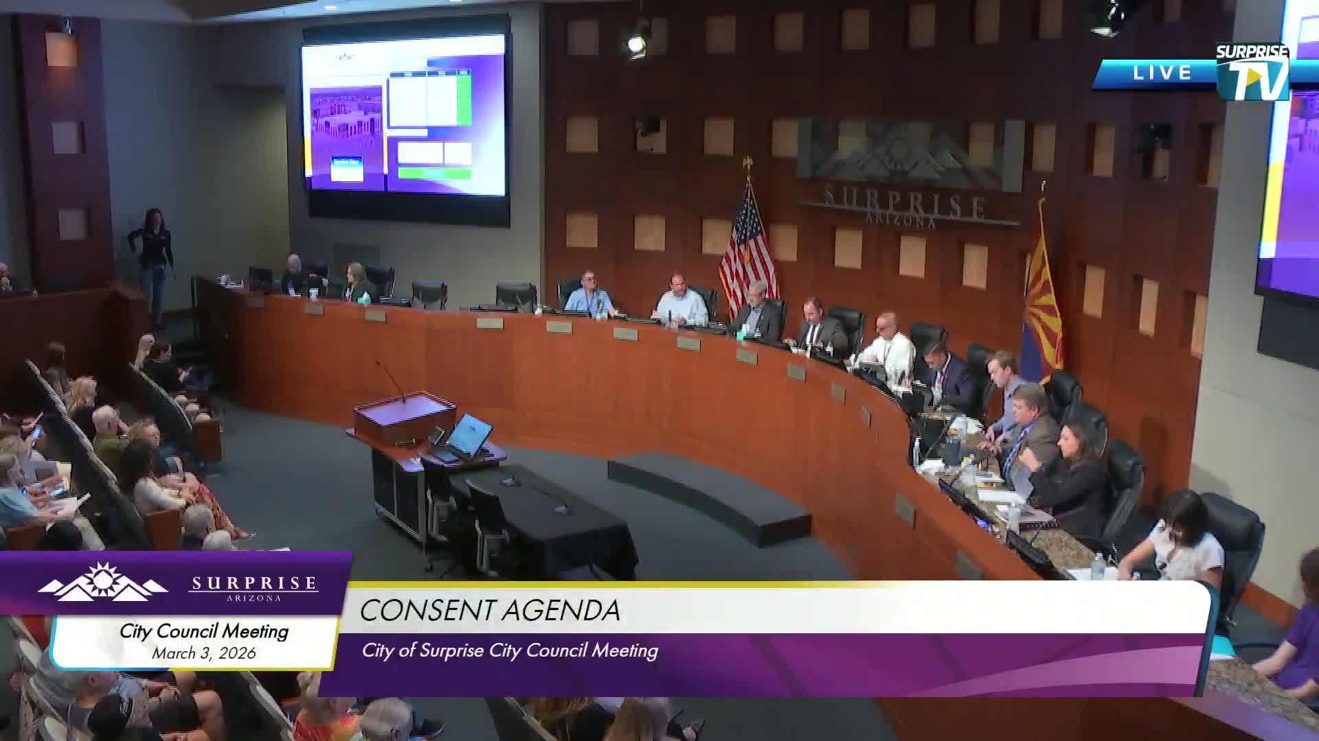After extended public comment and detailed questioning of the developer, the Surprise City Council moved to continue consideration of a rezoning for Mesquite Mountain Ranch to April 7 so staff and the applicant can add engineering detail and draft stipulations addressing an open‑space wash corridor, road improvements and unit caps.