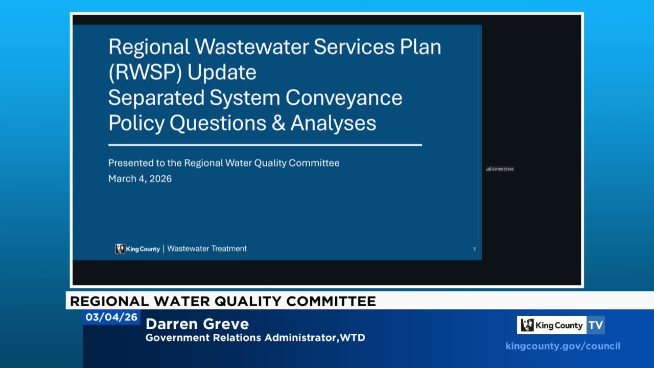 Chair Balducci opened the March 4 meeting of the Regional Wastewater Quality Committee to receive briefings on the Regional Wastewater Services Plan update and related 2027 rate work.