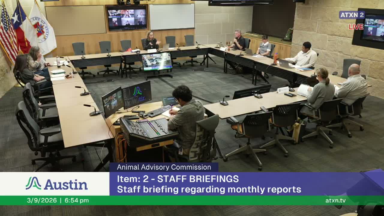 The commission voted March 9 to recommend that Austin City Council convert two temporary animal-care positions to full-time, fund two staff dog-walkers and a full-time animal enrichment specialist, and to highlight technology needs for Austin Animal Services; staff said cost estimates and procurement details remain to be provided.