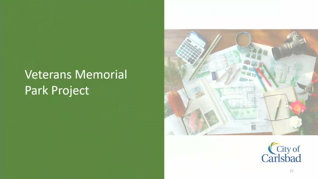 Staff told the commission that the Veterans Memorial Park master plan and public art were approved in October and the project is out to bid; Faraday Avenue improvements are being bid with the park to address traffic and parking needs, and the city expects to seek council authorization to award in January 2026.