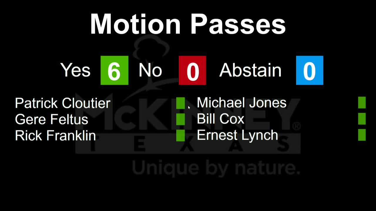 The City Council unanimously adopted a resolution authorizing the use of eminent domain to acquire needed easements for the Colin McKinney Parkway extension after staff said negotiations with the property owner were unresponsive.