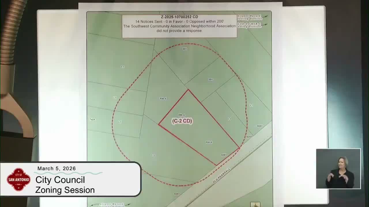At its March 5 zoning session, the San Antonio council approved rezoning 5051 Old Pearsall Road from RM-4 to C2-C-D with a conditional use to allow manufactured-home/oversized-vehicle sales and service, after council members said the proposed use reflects long-standing activity on the site despite staff recommending denial.