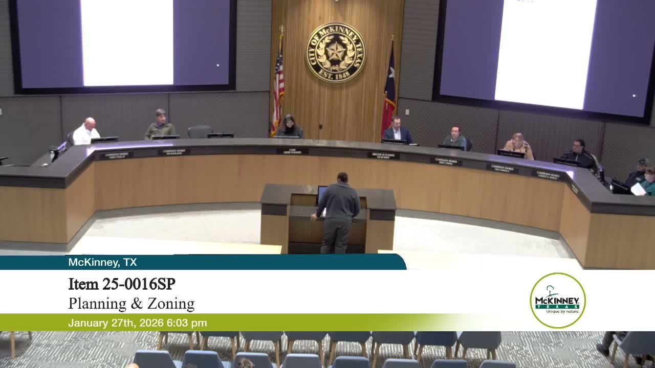 Kiara Robinson, downtown development planner for the City of McKinney, told the commission the request is for a “building form design exception” that would reduce the storefront transparency requirement for commercial buildings in the McKinney Town Center. Robinson said the exception would let the property “maintain the original building characteristics while still expanding the building footprint,” and staff recommended approval.
