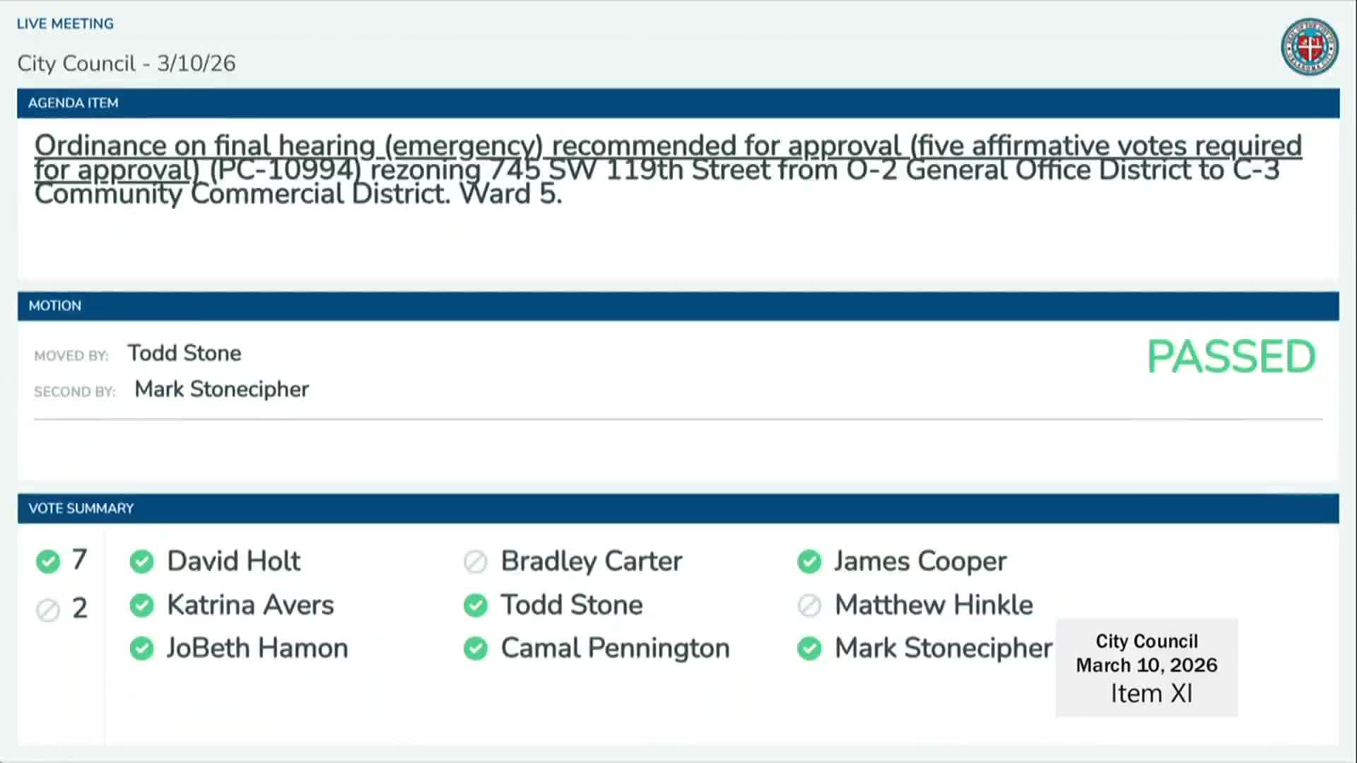 The Oklahoma City Council on March 10 unanimously voted to defer consideration of a planned-unit‑development rezoning west of Choctaw Road after extended public comment about flooding, traffic and emergency access.