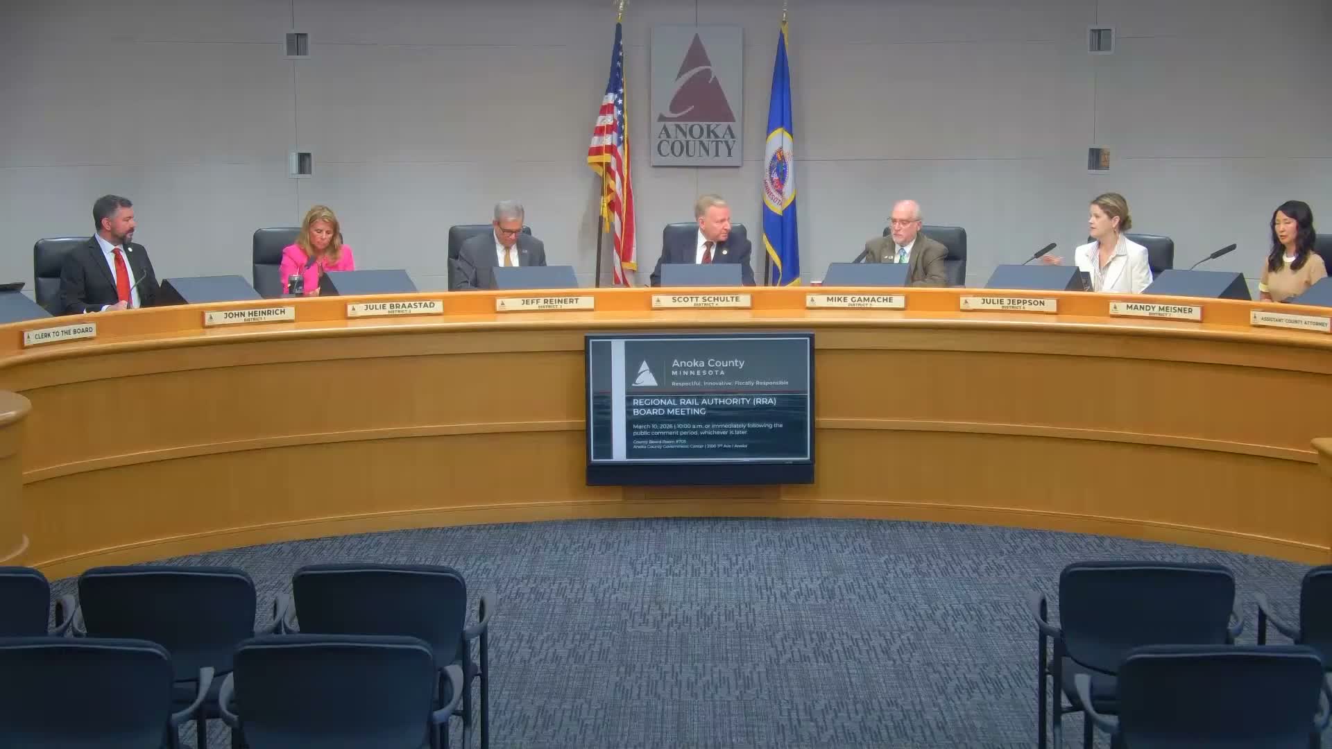 At a brief Anoka County Regional Rail Authority meeting the chair reported an introductory meeting with new Met Council chair Robin Hutchison, saying they discussed Northstar 'ramping down,' bus schedule implications, county parks and the need for more transit to outer parts of the county.