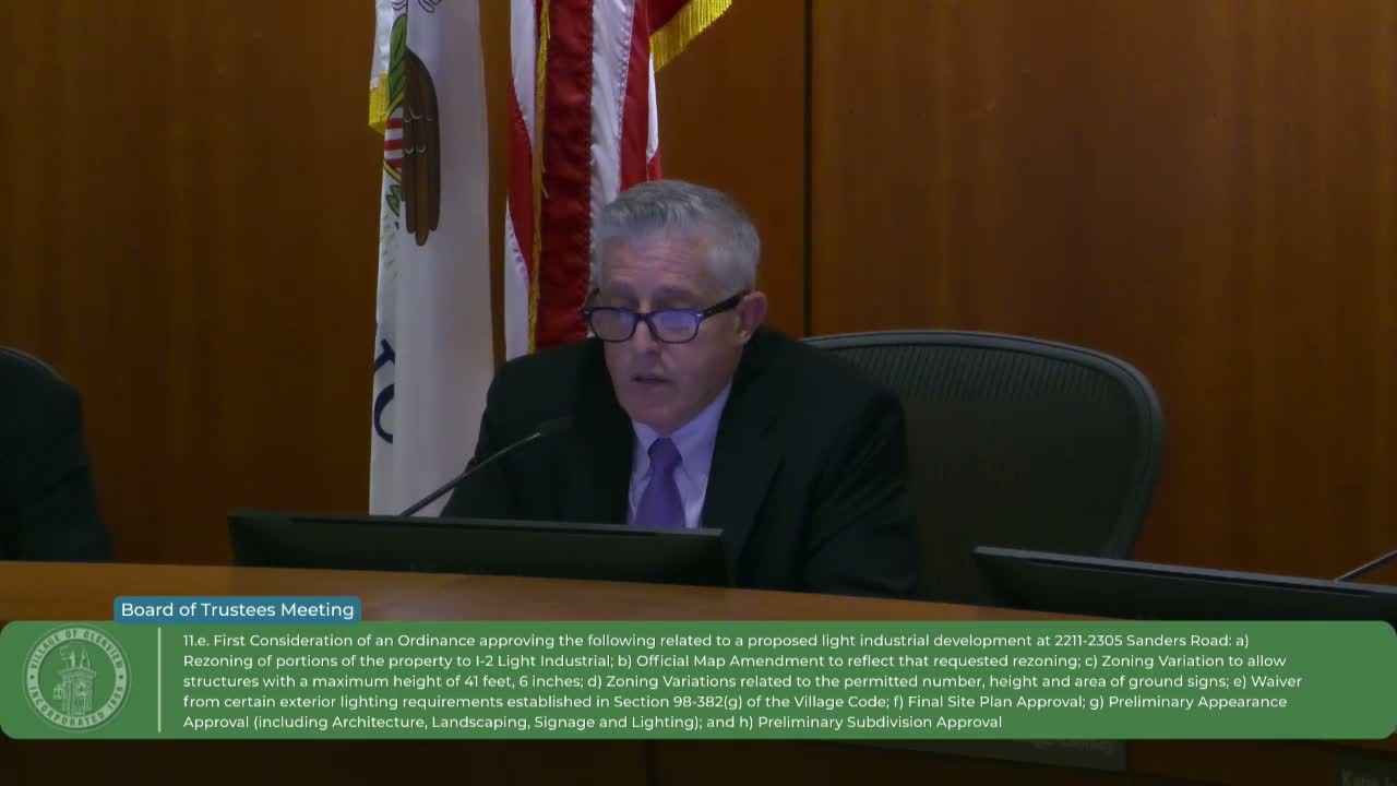 After hours of trustee questions and more than two hours of public comment, the Glenview Village Board approved rezoning and preliminary site approvals for the Sanders Corporate Park but instructed staff to add explicit definitions and restrictions for "light and clean" industrial uses; action on the developer's Cook County Class 6B tax incentive was continued to March 19 for further fiscal and ordinance work.