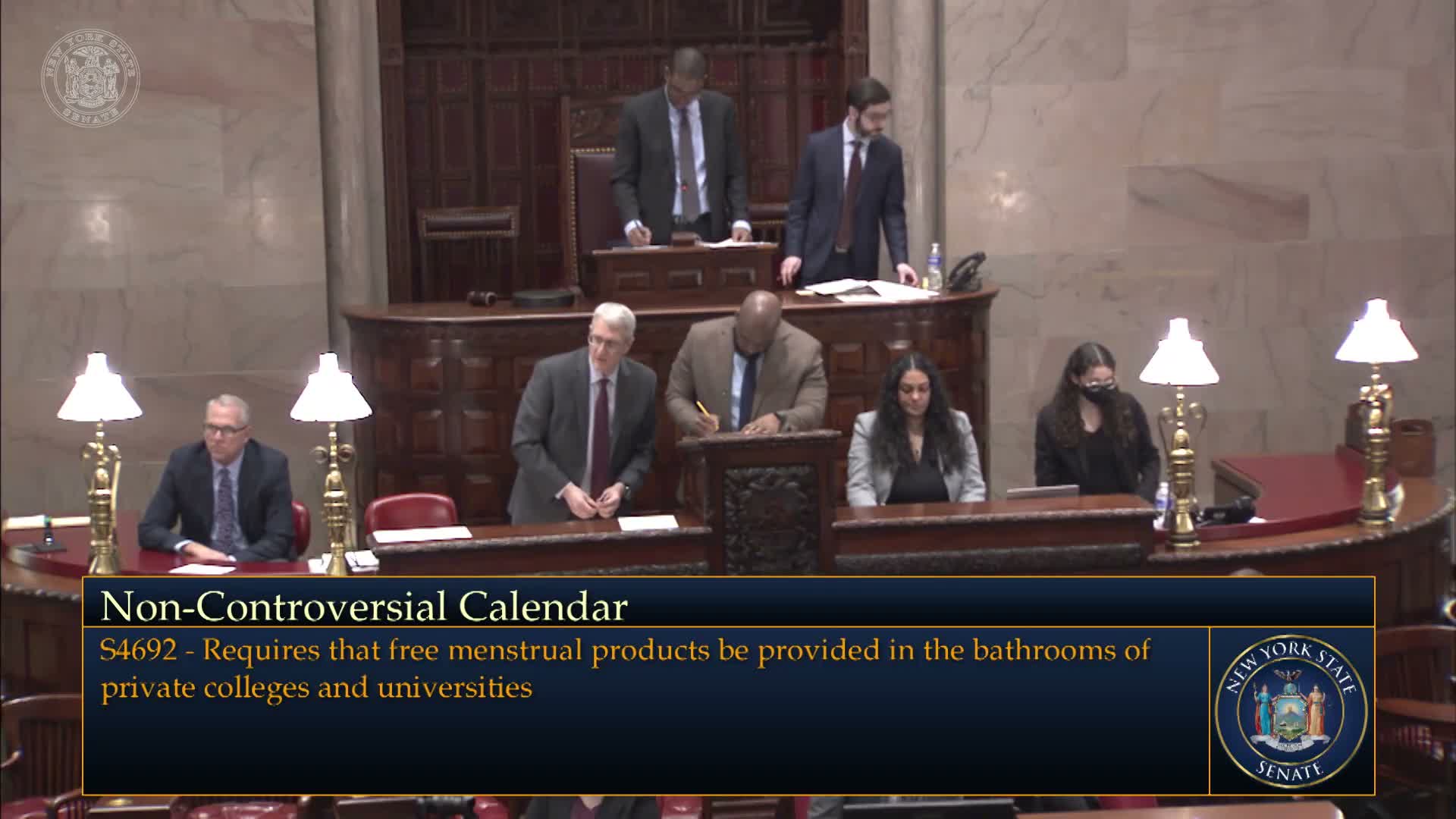 The Senate on March 9 approved legislation to require free menstrual products in the restrooms of educational institutions, with proponents framing the measure as a response to "period poverty." Senator Claire, recorded in the affirmative, said the bill continues a movement begun nearly a decade ago to ensure access to essential products and cited survey findings: "48 percent of students said they have struggled to access menstrual products due to cost or other barriers," and "19 percent of female college students reported that they felt forced to decide between buying period products and paying for other expenses such as food."