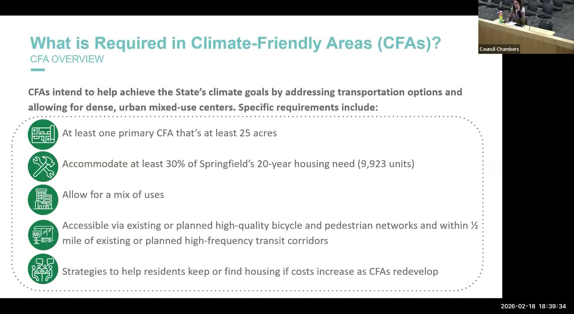 Senior planner Chelsea Hartman presented the proposed Climate Friendly Areas overlay district for Springfield’s downtown and Mohawk areas, explaining how local code amendments implement Oregon’s Climate Friendly and Equitable Communities (CFEC) rules.