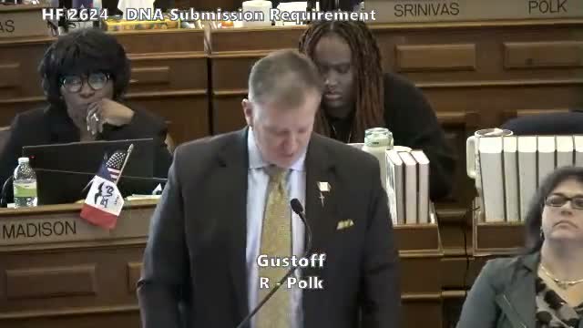 The Iowa House on Wednesday approved House File 2624, allowing law enforcement to take a limited buccal swab for DNA from people arrested for a felony or an aggravated misdemeanor with a violent element. The bill, described by sponsor Representative Frank Polk as a way to add a "21st-century fingerprint" to investigators' tools, passed the chamber after amendment and debate by a 57-29 voice-to-machine vote, with 14 members absent.